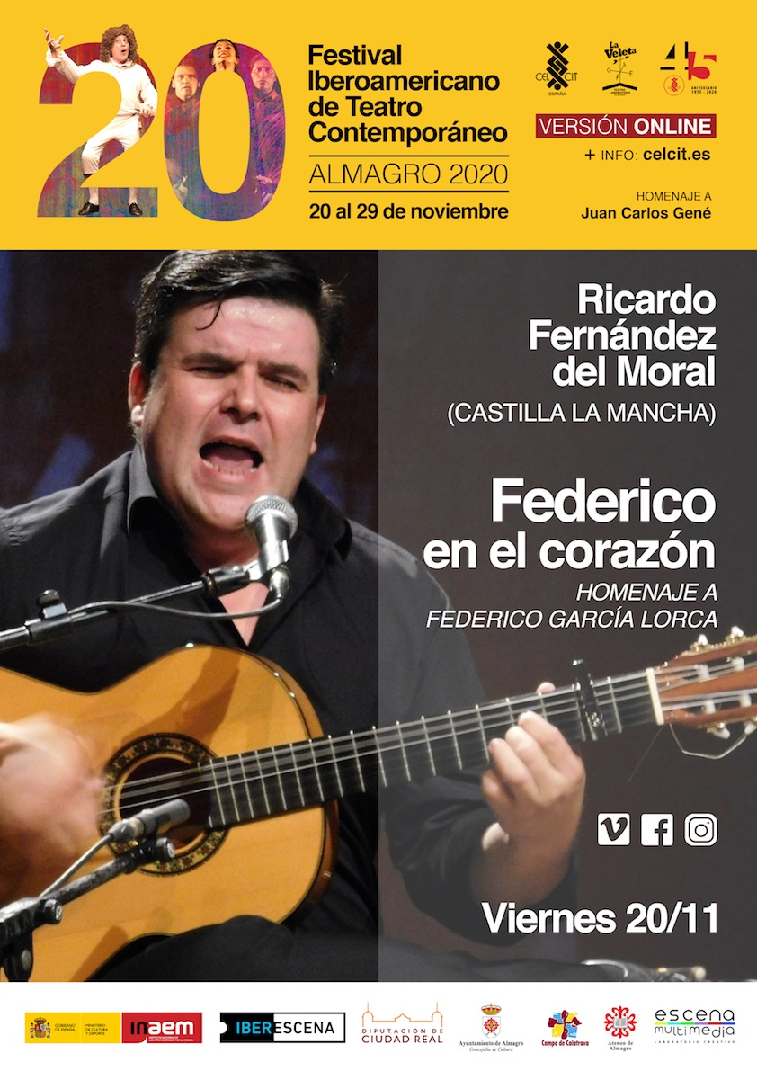 Este viernes, 20 de noviembre, comienza el 20º Festival Iberoamericano de Teatro Contemporáneo, con un especial protagonismo del flamenco, justo en la semana en la que se celebra el décimo aniversario de su declaración como Patrimonio Inmaterial de la Humanidad por la UNESCO, a cargo del guitarrista y cantaor castellanomanchego Ricardo Fernández del Moral con su homenaje a García Lorca “Federico en el corazón”. Recordar que este año, debido al COVID-19, el festival almagreño es virtual, retransmitido en streaming, a través de las plataformas virtuales Vimeo y YouTube.