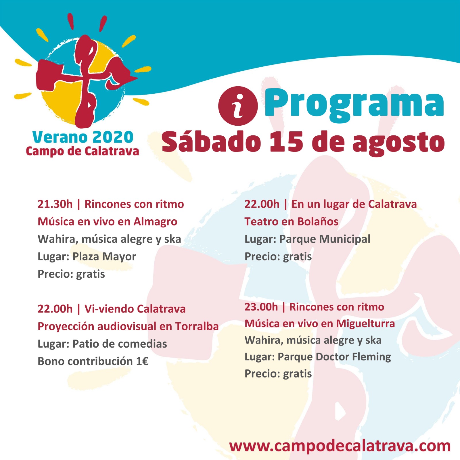 El sábado 15, la música en vivo se podrá escuchar en la Plaza Mayor de Almagro desde las 21.30 por el grupo Wahira, quienes luego se marcharán a Miguelturra para tocar en la plaza Doctor Fleming a partir de las 23 horas. Mientras que Bolaños ofrecerá, desde las 22 horas en el Parque Municipal, la obra “En un lugar de Calatrava”.