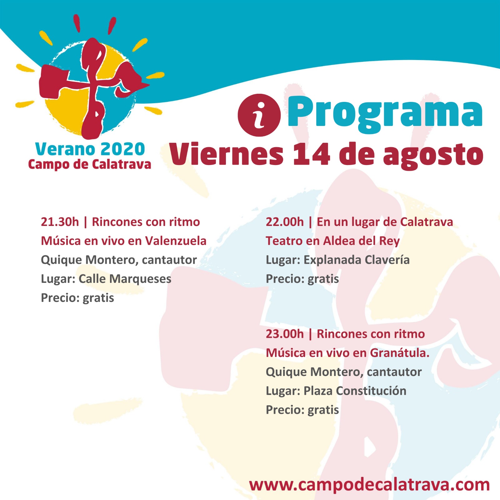 El viernes 14 de agosto, el teatro de calle “En un lugar de Calatrava será el protagonista de la noche en Almagro, a partir de las 22 horas en la explanada del Palacio Clavería. Este día, la música de “Rincones con ritmo” sonará en Valenzuela, a cargo del cantautor Quique Montero, en la calle Marqueses, desde las 21.30 horas, para después hacerlo en la vecina Granátula este mismo artista, en la Plaza de la Constitución, desde las 23 horas.